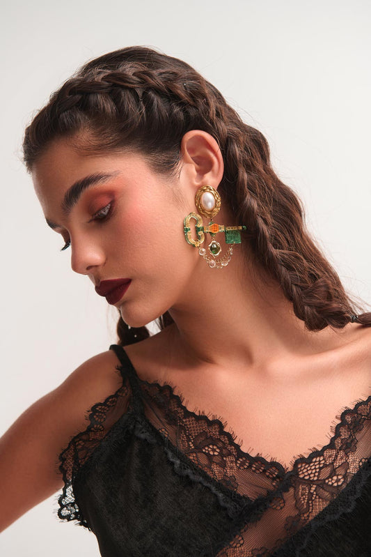Boucle d'oreille Secret Key en plexiglas avec perles et chaînes alice aux pays des merveilles