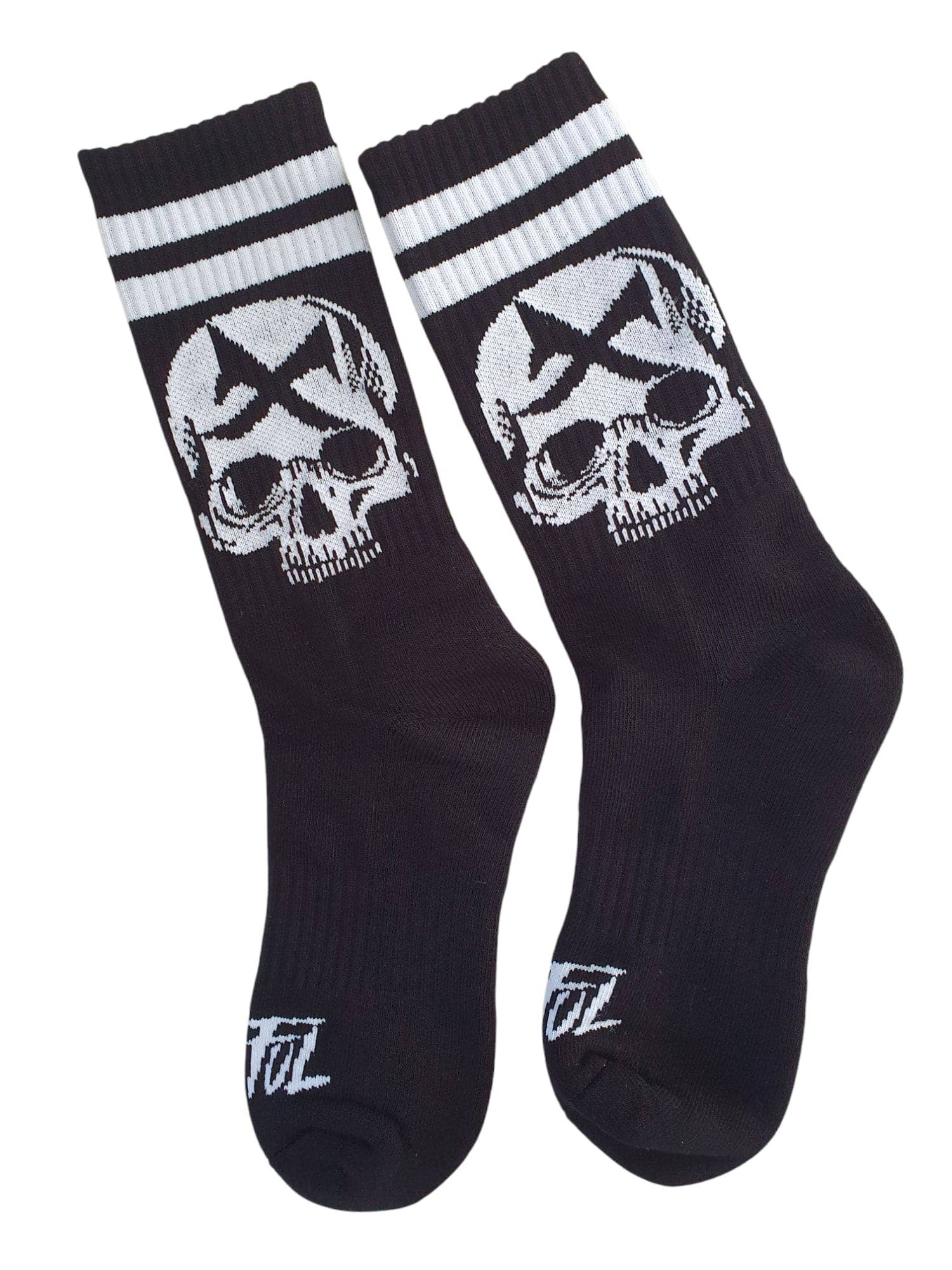 Enfilez ces chaussettes crew mi mollet aux teintes sombres et mystérieuses, ornées d'un crâne blanc captivant.
