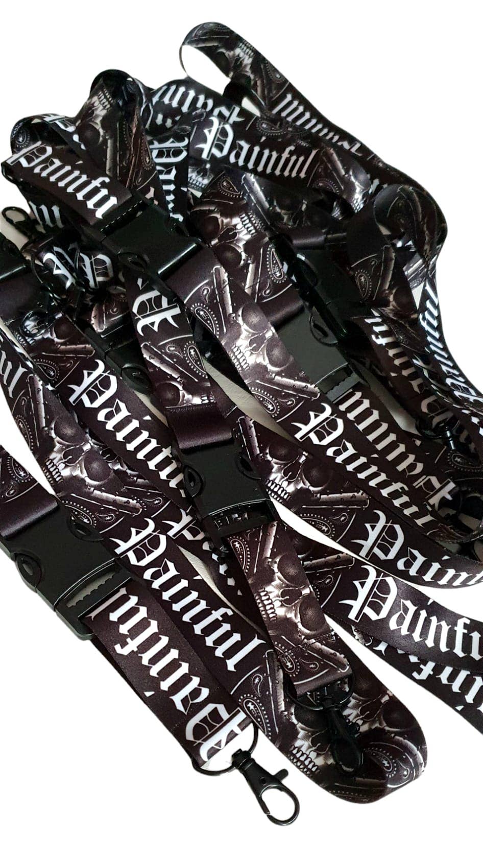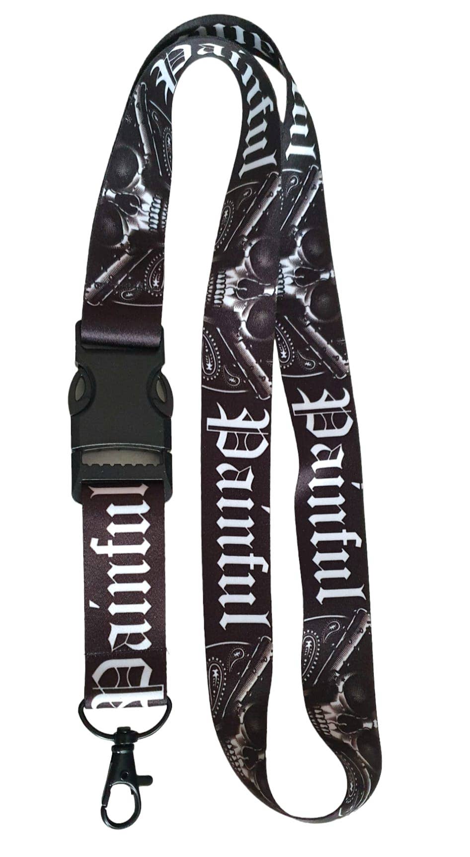 Lanière de cou PAINFUL au design hardcore, imprimée recto verso pour un style affirmé. Confectionnée en acrylique 100% avec une largeur de 25 mm, elle accueille vos clés, pass et accessoires via sa boucle plastique pratique. L'attache acier robuste garantit une tenue sécurisée au quotidien.